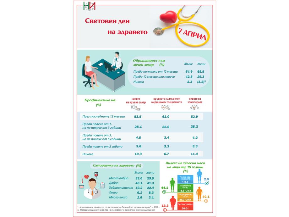 Инфографиката представя статистически данни за достъпа до здравни услуги и профилактиката на някои рискови фактори за социалнозначими заболявания в България.