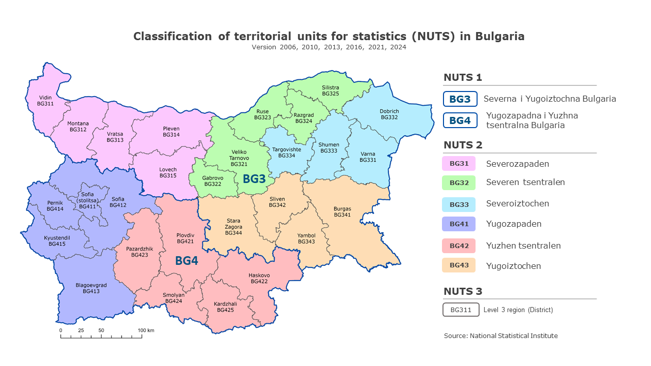 he current version of the classification was adopted by the Commission Delegated Regulation (EU) 2026/195 of November 13, 2025, and its section on Bulgaria was approved by Order No. RD-05-111, February 18, 2026 of the President of NSI. Under this regulation, the entire country forms a single NUTS level 1 region, which is subdivided into four NUTS level 2 regions and 28 NUTS level 3 regions.