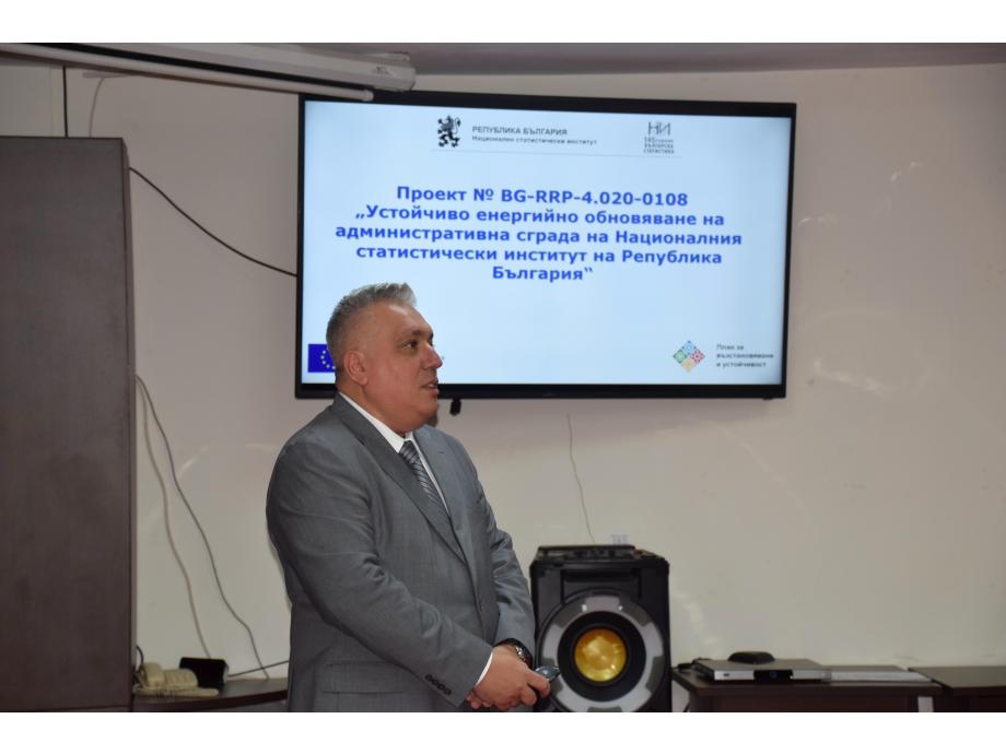 „Административната сграда на Националния статистически институт ще бъде модернизирана и ще стане енергоефективна до юни следващата година по проекта на НСИ "Устойчиво енергийно обновяване на административна сграда на Националния статистически институт на Република България" по Плана за възстановяване и устойчивост.“ Това обяви председателят на НСИ доц. д-р Атанас Атанасов по време на публично събитие, на което беше представен проекта. „След приключване на ремонтните дейности вече ще бъдат редуцирани разходите, които правим за отопление през зимата и за охлаждане през лятото, и най-важното – сградата ще бъде уютна за служителите на Националния статистически институт , защото мисля, че го заслужават“, допълни доц. Атанасов.