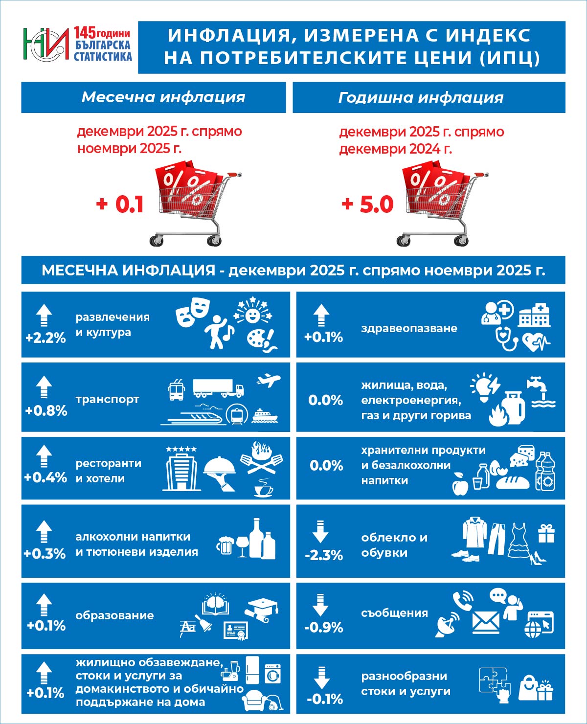 Месечната инфлация е 0.1%, а годишната инфлация е 5.0%. Инфлацията е измерена чрез ИПЦ, като месечната инфлация се отнася за декември 2025 г. спрямо предходния месец, а годишната инфлация е за декември 2025 г. спрямо същия месец на предходната година.