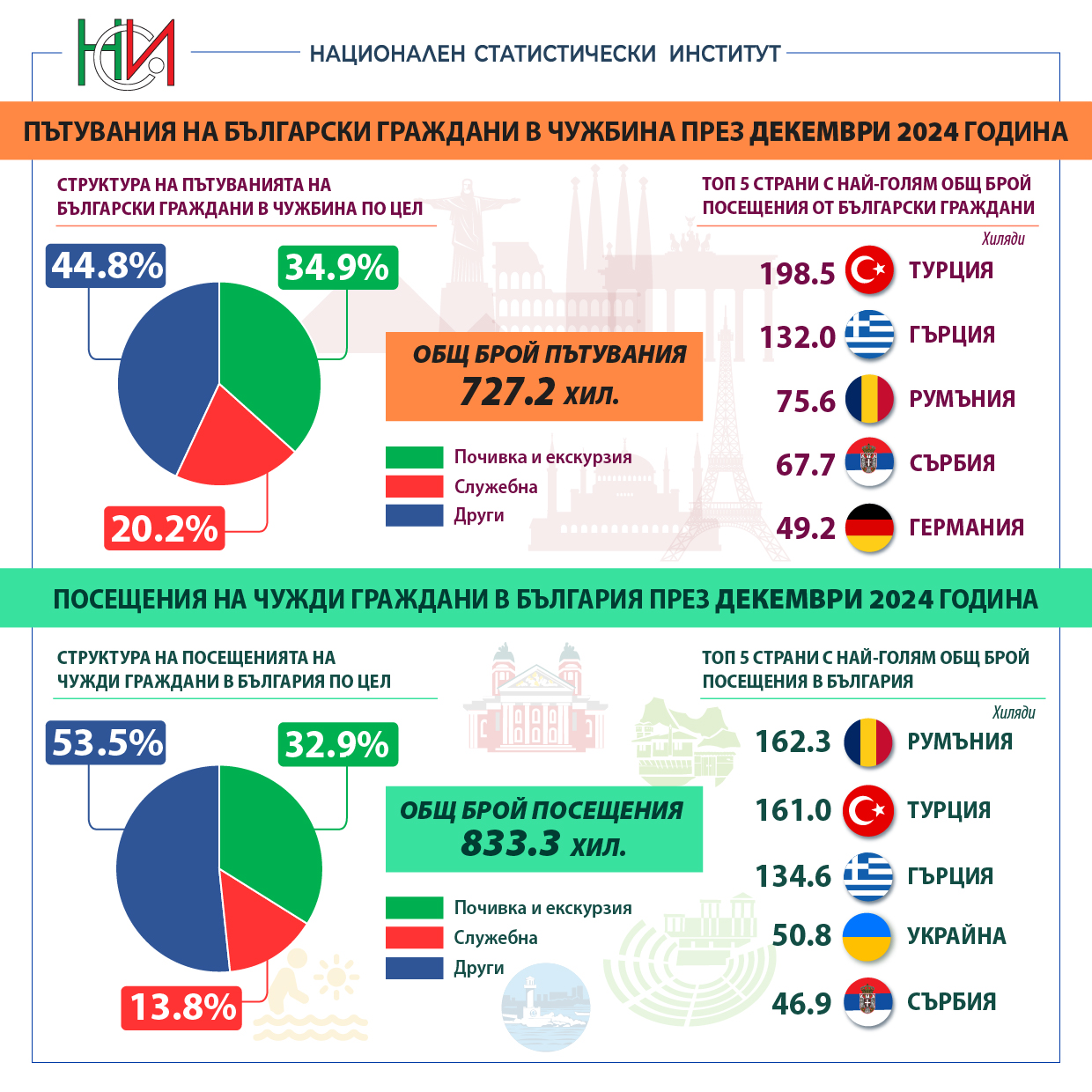 Пътуванията на български граждани в чужбина през декември 2024 г. са 727.2 хил., или с 12.0% повече от декември 2023 година. Регистрирано е увеличение на пътуванията по всички наблюдавани цели.