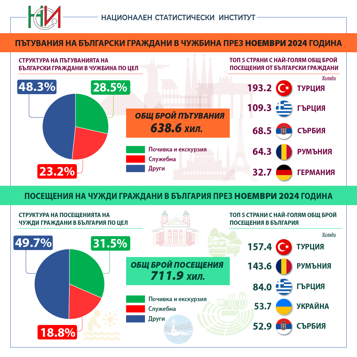 Пътуванията на български граждани в чужбина през ноември 2024 г. са 638.6 хил., или с 11.3% повече от ноември 2023 година. Регистрирано е увеличение на пътуванията по всички наблюдавани цели.