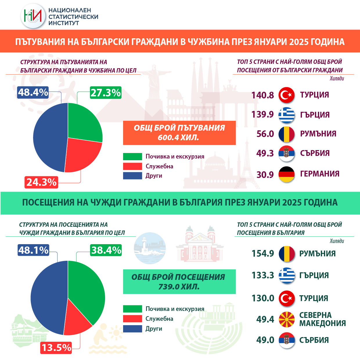 Пътуванията на български граждани в чужбина през януари 2025 г. са 600.4 хил., или с 11.7% повече в сравнение с януари 2024 година. Регистрирано е увеличение на пътуванията по всички наблюдавани цели.