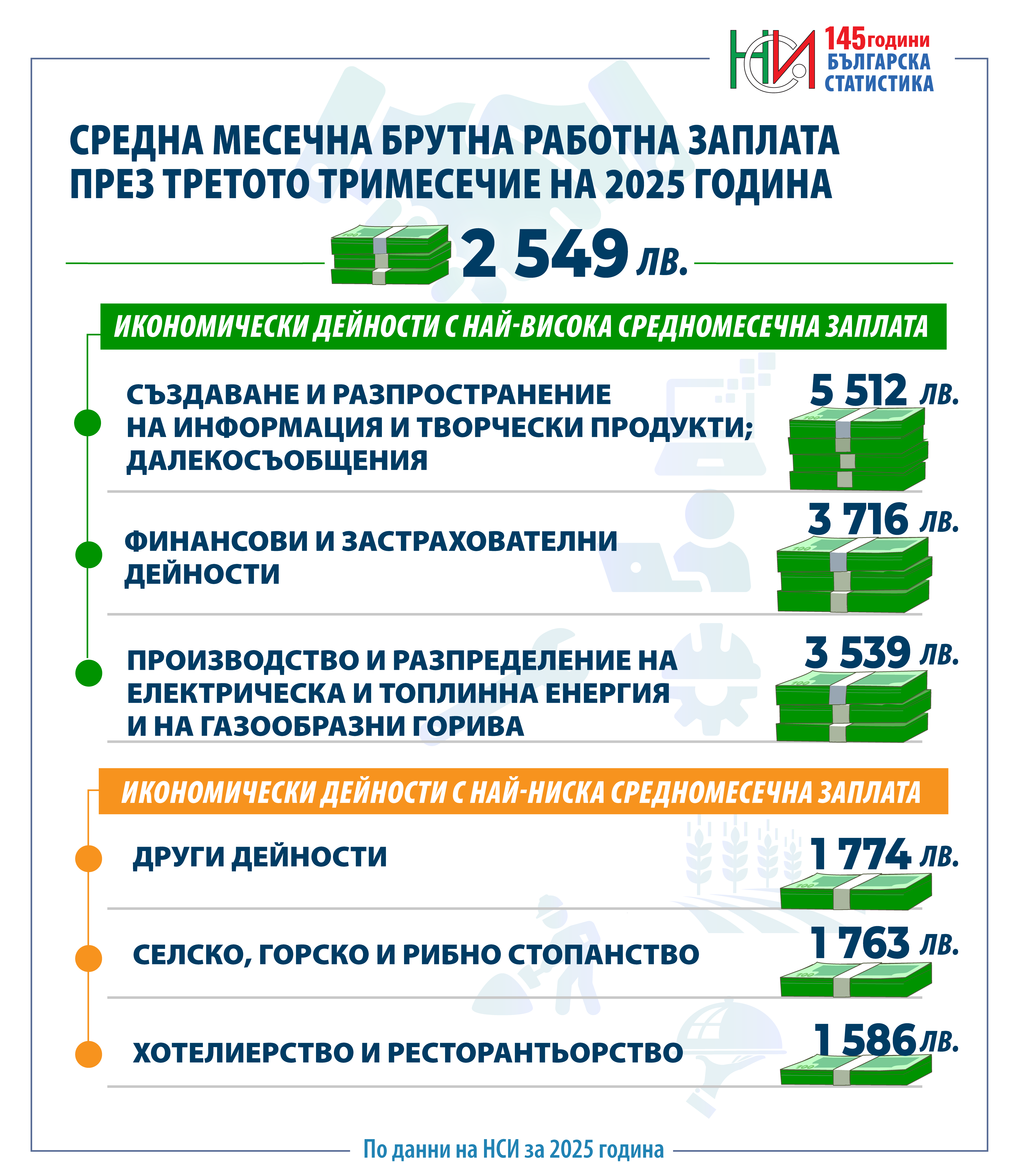| Извадкови грешки | За оценка на стохастичната точност на резултатите от наблюдението на наетите лица, отработеното време, средствата за работна заплата и други разходи за труд се изчисляват коефициенти на вариация (относителни стандартни грешки) и интервали на доверителност (обхватът от стойности, които в 95% от случаите съдържат истинската стойност на показателя в генералната съвкупност) по основни показатели. За трето тримесечие на 2024 г. за частния сектор на икономиката те са: Показатели | Оценка | Коефициент на вариация - % | Интервал на доверителност | Долна граница | Горна граница | Списъчен брой на наетите лица към края на месеца – брой | 1738687 | 0.5 | 1720712 | 1756663 | Средна месечна работна заплата за тримесечието – левове | 2256 | 0.4 | 2239 | 2274 | Разходи за труд за един отработен час - левове | 18.87 | 0.4 | 18.73 | 19.01 | Свободни работни места – брой | 9432 | 3.7 | 8746 | 10117 |