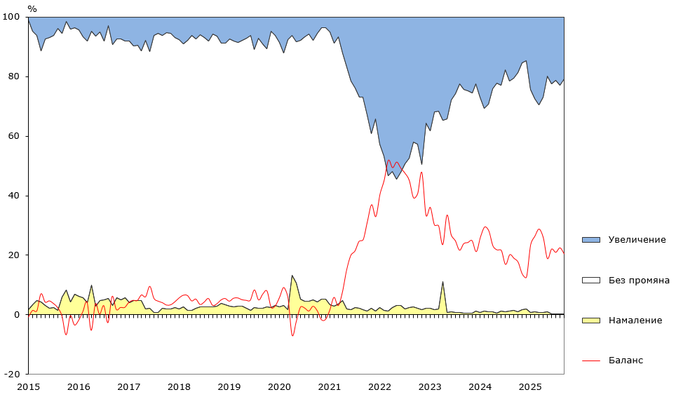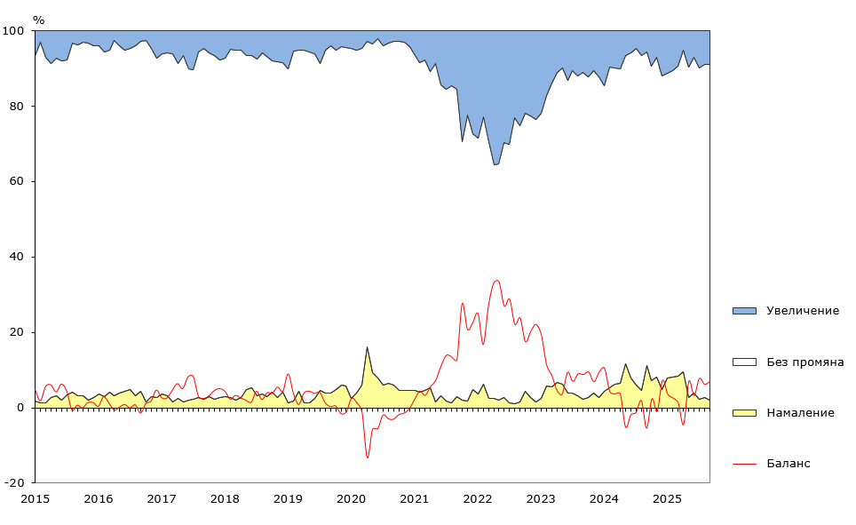 30.10.2025 Наблюдение на бизнес тенденциите в промишлеността, строителството, търговията на дребно и услугите - октомври 2025 година