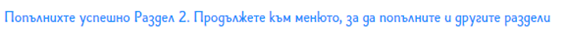 При успешно записване на информацията, в долната част на страницата ще се появи съобщение за потвърждение. Надписът ще информира, че данните са записани успешно, и ще можете да преминете към следващия раздел, след натискане на бутона,