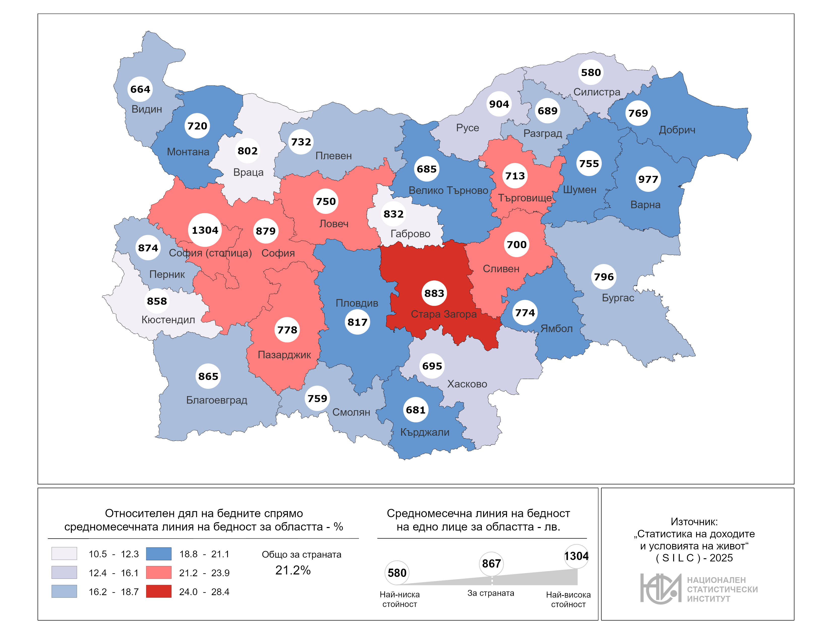 През 2025 г. най-ниската линия на бедност се наблюдава в областите Силистра и Видин - съответно 580 и 664 лв., а най-високата - в област София (столица) - 1 304 лв., следвана от областите Варна (977 лв.), Русе (904 лв.) и Стара Загора (883 лева).