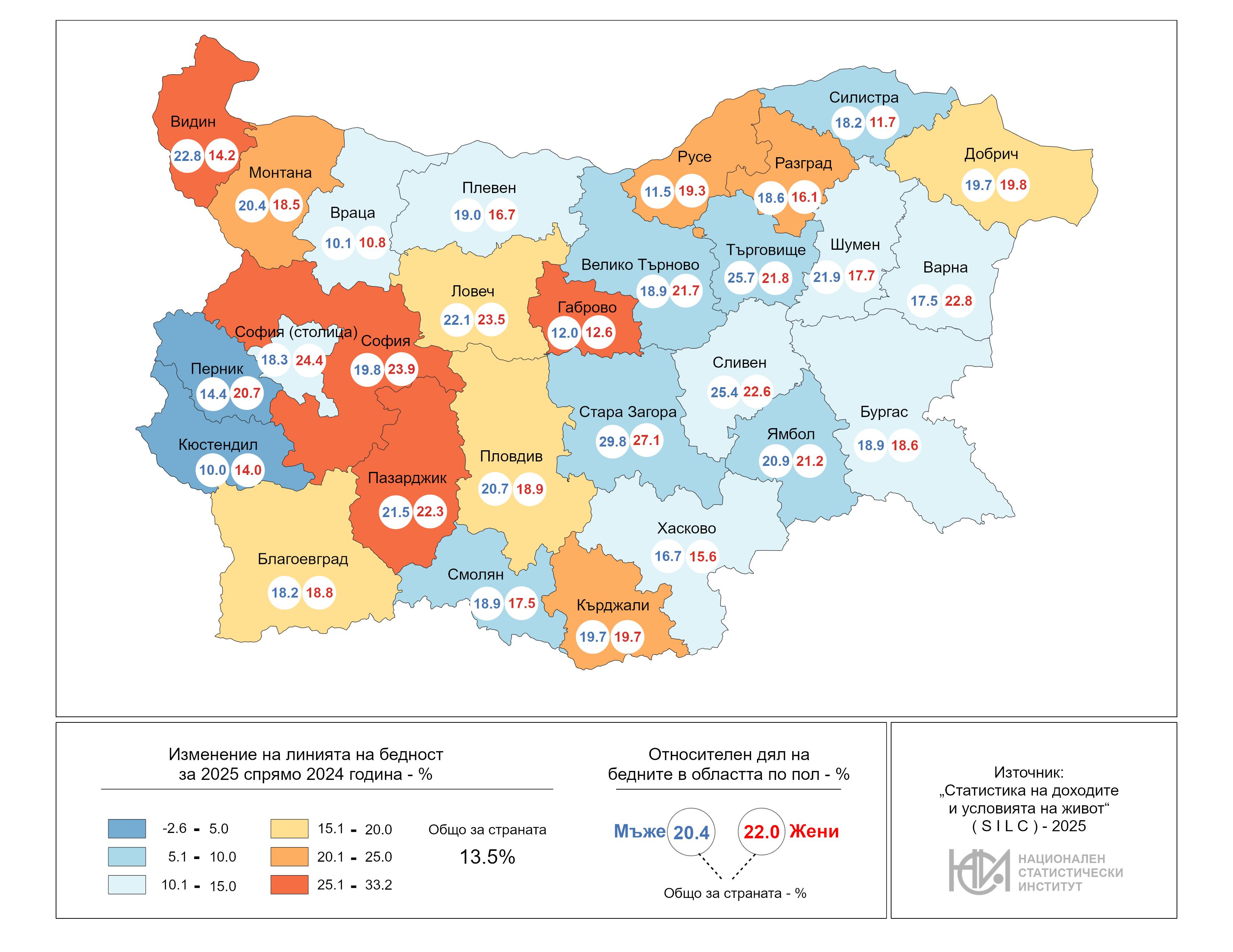 През 2025 г. област Кюстендил е с най-нисък относителен дял на бедност за мъжете - 10.0%, а с най-високо равнище е област Стара Загора - 29.8%. В област Враца жените са с най-ниско равнище на бедност - 10.8%, при 27.1% за област Стара Загора.