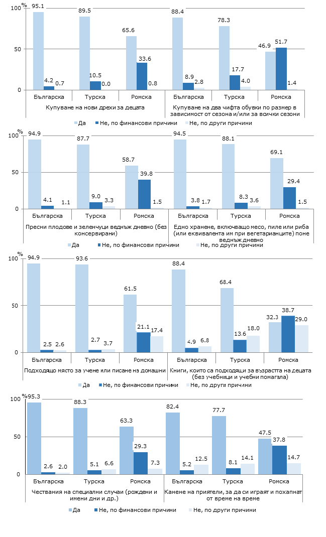 Възможността да се осигурят определени потребности на децата се различава в зависимост от етническата принадлежност. През 2025 г. относителният дял на децата с материални лишения (лишени от поне един от 13 показателя) e, както следва: 17.3% от българската етническа група, 29.6% от турската етническа група, 73.5% от ромската етническа група и 17.1% от друг етнос. Нито една потребност (ограничения за всички 13 показателя) не може да бъде осигурена за 0.3% от българската етническа група, за 0.6% от турската етническа група и за 4.6% от ромската етническа група. Около 29.0% от децата с материални лишения от българската етническа група живеят и в риск от бедност. За останалите групи относителните дялове са следните: 34.0% от турската етническа група и 75.5% от ромския етнос.
