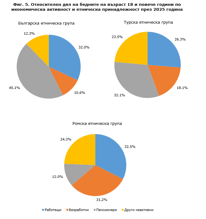 Наблюдават се различия в разпределението на бедните от различните етнически групи според икономическата им активност (виж фиг. 5). Сред бедните от българската и турската етнически групи преобладават пенсионерите (съответно 45.1 и 32.1%), докато при ромската етническа група най-висок е относителният дял на заетите лица (32.5%).