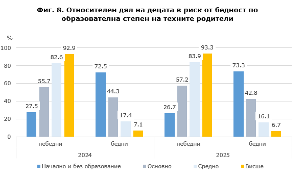 Достигнатата образователна степен и професията на родителите са важен фактор за бъдещото развитие на децата. По-високото образователно равнище дава възможност за по-широк достъп до пазара на труда и съответно до по-високо заплащане. През 2025 г. седем от десет деца (73.3%), чиито родители са с начално или без образование, живеят в бедност (виж фиг. 8). Приблизително 11 пъти по-малко, или 6.7%, са децата, чиито родители са с висше образование и живеят в риск от бедност.