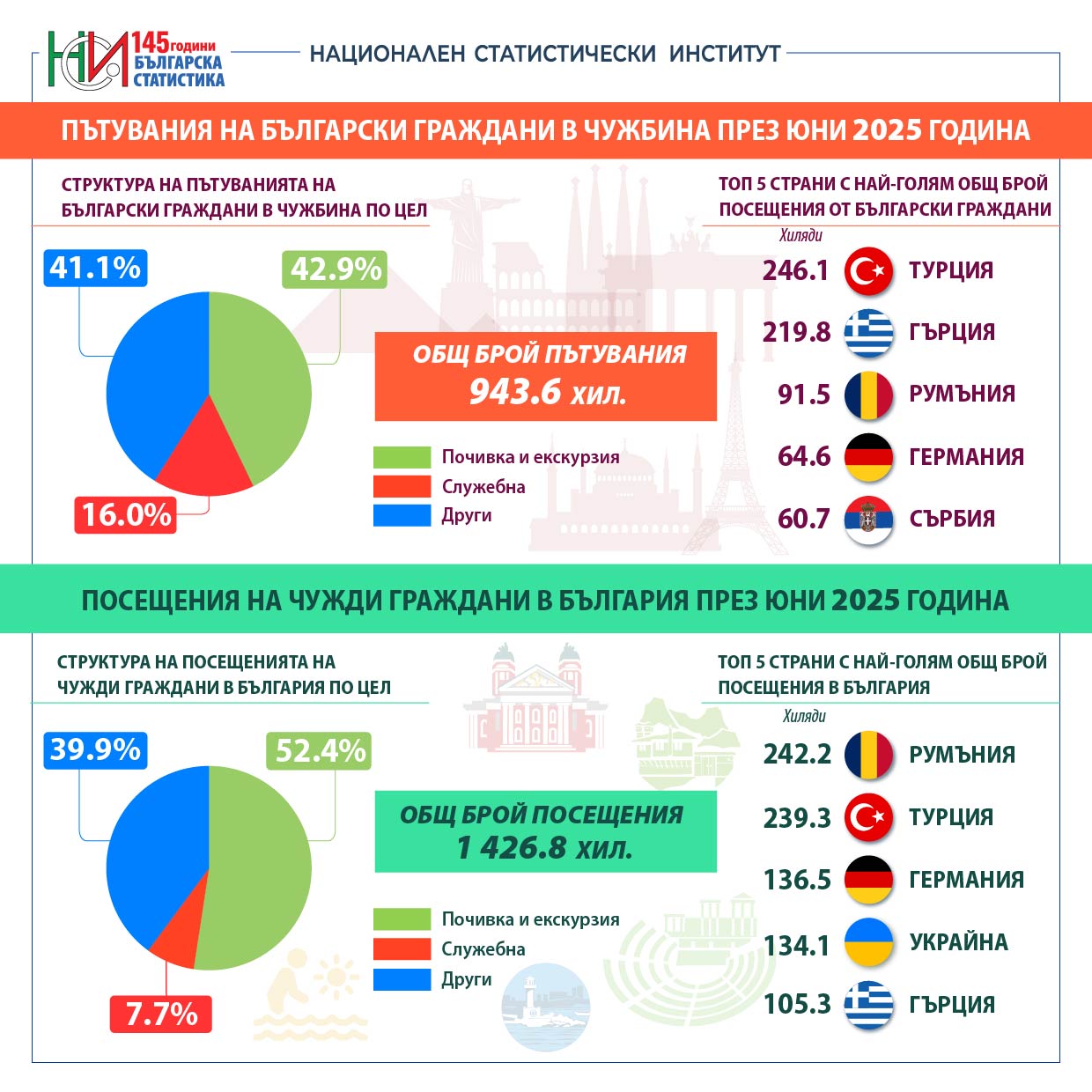Пътуванията на български граждани в чужбина през юни 2025 г. са 943.6 хил. (виж табл. 1 от приложението), или с 10.4% повече от юни 2024 година (виж фиг. 1). Регистрирано е увеличение на пътуванията по всички наблюдавани цели.